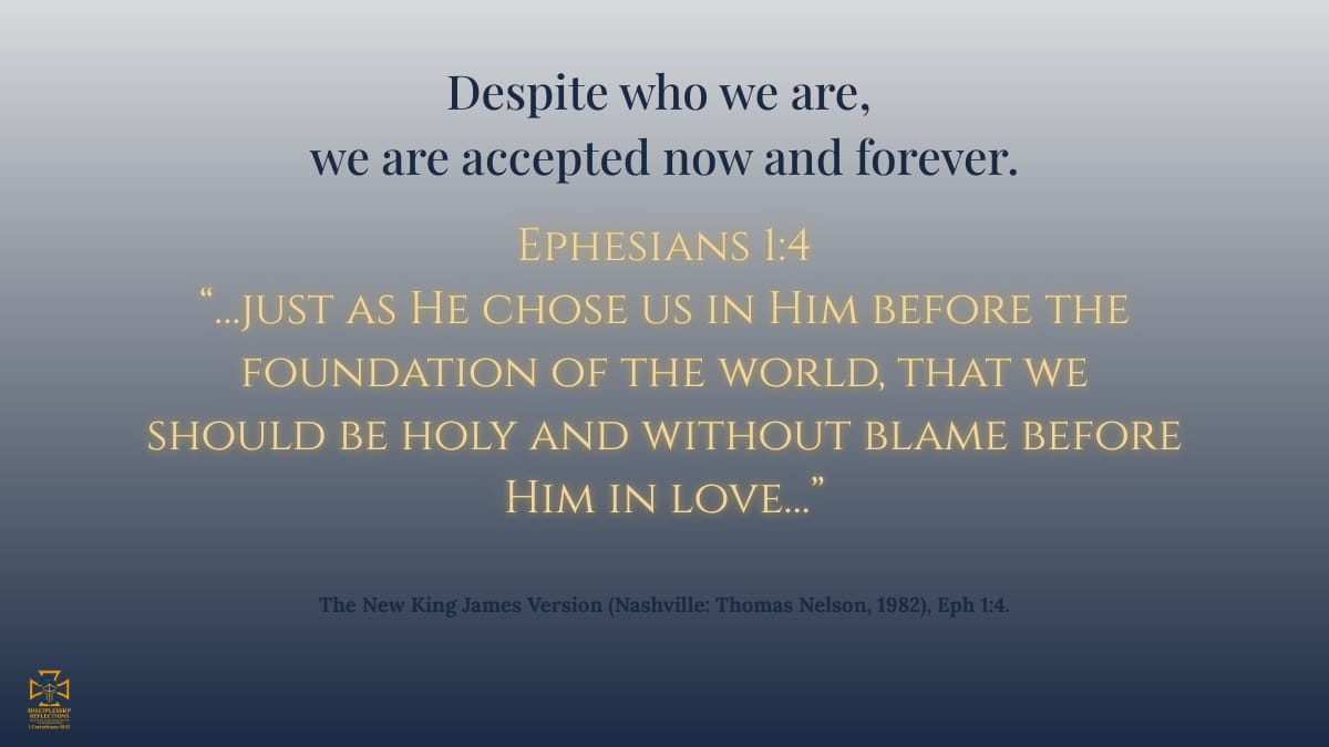 Dear brothers and sisters, let us recognize this important truth: God called us into the Body of Christ not because of our works, but simply because He loved us. His love for us is unconditional and unchanging. He created, chose, and accepted us, revealing in us, who believe, the mystery of the gospel of grace in Christ Jesus. Therefore, we should not live in guilt, trying to earn God’s love, but embrace the assurance that we are accepted now and forever because of His love for us. Let us live and serve out of love for what He has done for us, not to gain anything from Him.